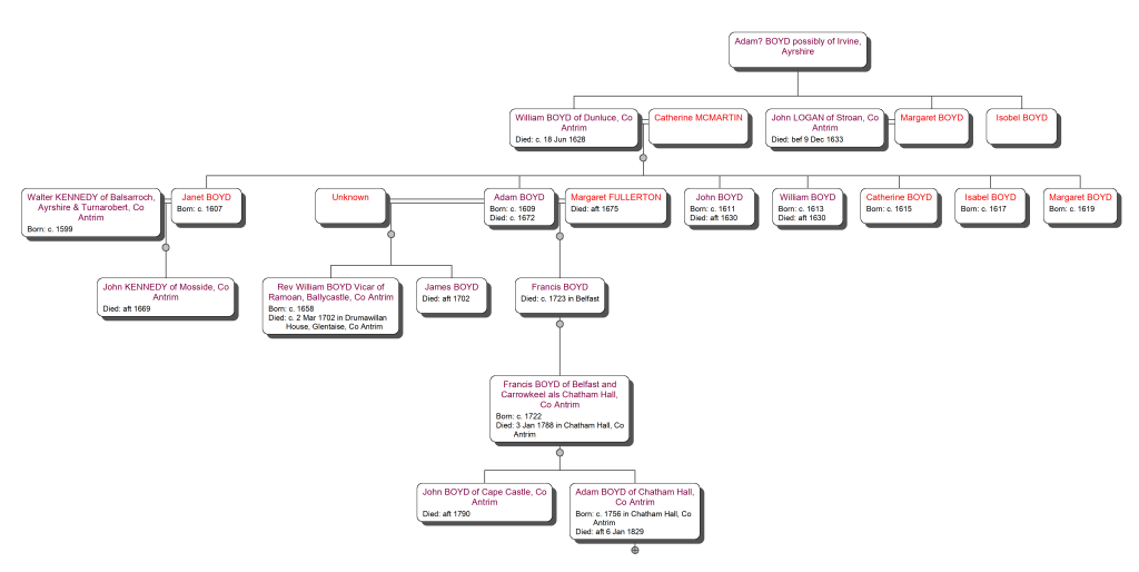 Before concluding our text on Adam Boyd and looking at the remaining children of William Boyd of Dunluce it is perhaps worth recording a possible lineage from the information already mentioned. In the tree below we have incorporated both the McGill research and our own based on the available evidence suggesting in particular that Adam Boyd son of William Boyd of Dunluce had likely married twice with Rev William Boyd and James Boyd being children of the first marriage.