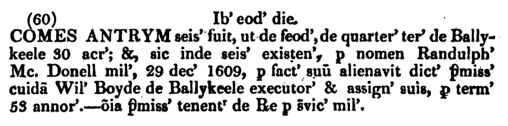 Th entry above states that 30 acres of land in the quarterland of Ballykeele was held by the Earl of Antrim in the name of Randolph(Randal) McDonnell on 29 December 1609 it was then alienated to William Boyde of Ballykeele his Executors and Assigns for the term of 53 years and in lieu of Kings Service. However this same entry appears to have been examined by John Lodge who records the following:-