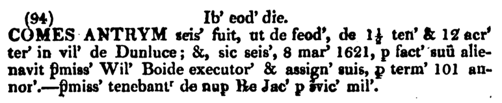 It is more likely from similar transactions on the Antrim estate in the 1600s that the term of the lease to William Boyd for the 30 acres in Ballykeele was 503 years and not 53 as recorded in Hardiman’s Inquisition. We also need to identify where Ballykeele is as no other information on Barony or Parish is given. The most likely candidate is Ballykeel in the Parish of Dunluce lying roughly mid way between the town of Portrush and Dunluce Castle to the east. Then a further entry in the Inquisitions.4