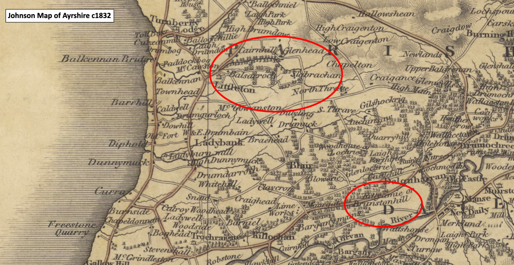- “Kraig” in the parish of Kilmaurs, and part of the barony of Robertoun, also occurs on the map, and belonged in 1576 to William Dunlop, who in that year was serverd heirs to his grandfather, Adam Dunlop of Craig. William Dunlop, younger, of Craig, is appointed a Sub Commissioner for valuing the Teinds in the Presbytery of Irvine in 1630. William Dunlop of Craig, and William Dunlop, younger, of Craig are mentioned as bailie and witness in the infeftment of Mr William Cauldwell as heir of his father William, in the 20s land of Annandhill, 1638 (Broun’s Protho. Buik). “Robert Montgumrie Laird of Haishilhead and Williame Dunlop laird of Craig reuling elders” in the Presbytery, occur in the Act, 1641, Charles I., anent the New Kirk of Kilmarnock.