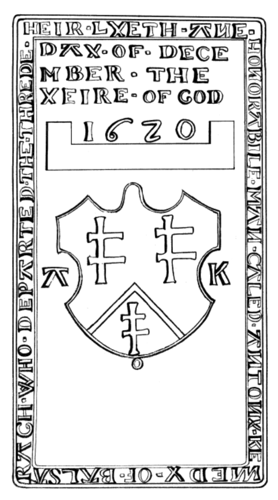 Anthony Kennedy Junior likely died in Ballyloughbeg on 3 December 1620 as he was buried, probably within the old church in Billy Parish. In 1858 his gravestone was unearthed within the walls of the old church and a sketch made of the inscription and armorial etc.21