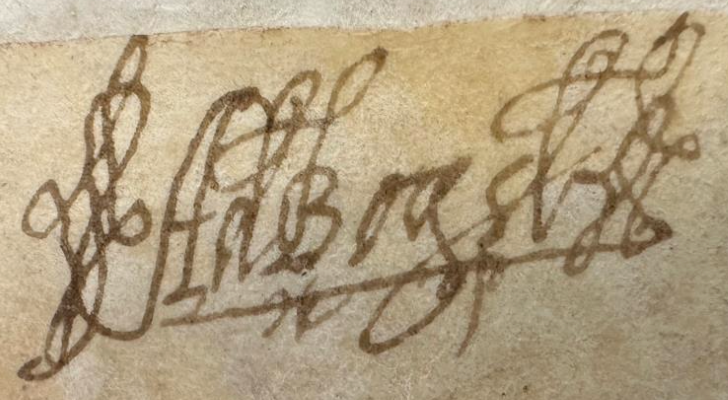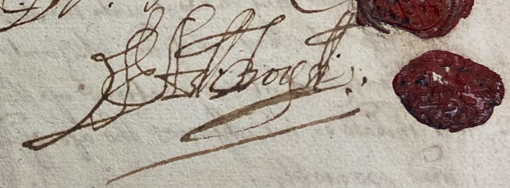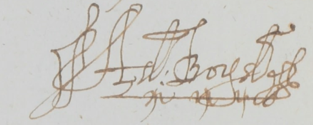 We next find an item amongst the National Records of Scotland.27 It is described as a receipt by Adam Boyd of Bushmills to Sir Andrew Agnew for a lease of several lands in he Barony of Glenarm granted to the latter’s father (Sir Patrick Agnew) by the late Earl of Antrim dated 16 October 1657. Wonderfully Adam’s signature (see below) survives at the foot of the receipt