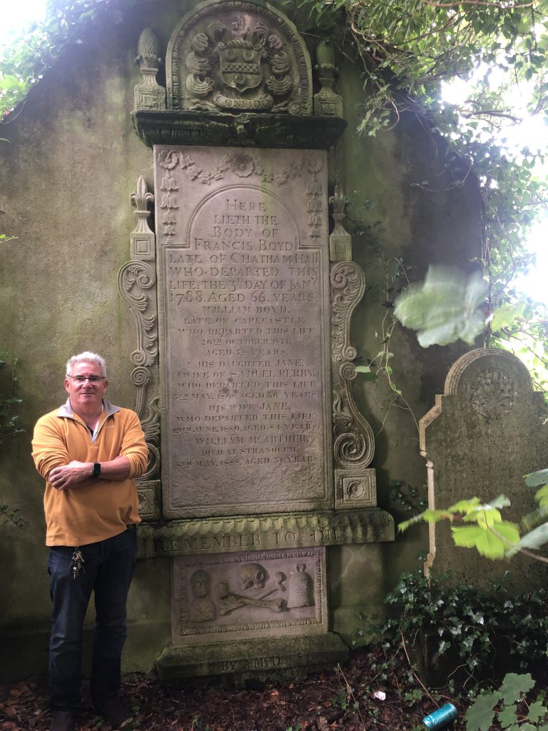 At this point the only child of Adam Boyd that we can be certain of is Francis Boyd from the 1679 deed and it is perhaps worth making an attempt to trace any possible lineage from him. A search through various records for the Connor Diocese reveals an Index entry for an Administration Bond concerning a Francis Boyd of Belfast in 1723. The name Francis is quite rare amongst the Co Antrim Boyds in the 17th and 18th centuries and although this Francis was likely resident in Belfast he could be the son of Adam Boyd of Carnmoon. Interestingly we find that the lands secured by Adam Boyd for his wife and son mentioned in the 1675 indenture above are leased33 by the Earl of Antrim to Alexander Andrews of Carnkirn in 1712 suggesting that by that date Margaret and Francis Boyd have either died or sold on their interest. Perhaps one explanation is that Margaret has likely died and Francis has moved to Belfast. One clue suggesting this possibility comes in the form of another Francis Boyd whose grave/memorial can be found today in old Ramoan Parish graveyard, Ballycastle, Co Antrim (see below).