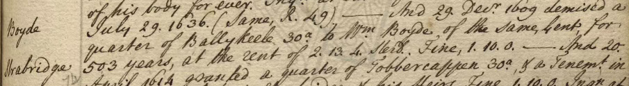 By 1637 we find a lease dated 17 August between the Rt. Hon. Randal Earl of Antrim to Adam Boyde, Gentleman, of Coleraine, Co. Londonderry, of the quarterland of Liswatticke [Liswatty Upper & Lower, Ballyrashane, Co Londonderry]. Yearly rent 40s.23 Wonderfully the signature of Adam Boyd is on the foot of the deed.