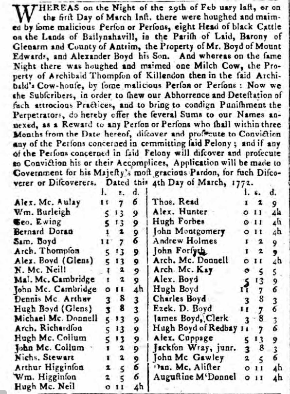 Before looking further at the life of Capt. Hugh Boyd of Clontyfinnan & Mount Edwards it is perhaps worth recording the background to the lands that he leased along with Rev Samuel Dunlop. Through a timeline of events from 1687 to 1721 involving these lands in the parish of layde, Co Antrim we have a snapshot of some significant moments in Irish history.