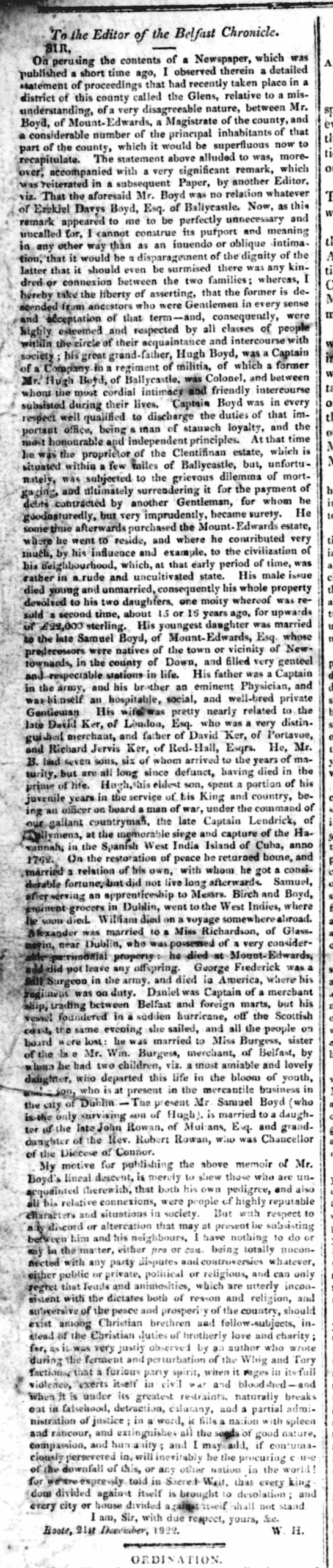 Finally in the Belfast Commercial Chronicle for 28 December 1822 we find a remarkable letter to the editor from W.H. of the Roote dated 21 December 1822.