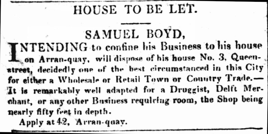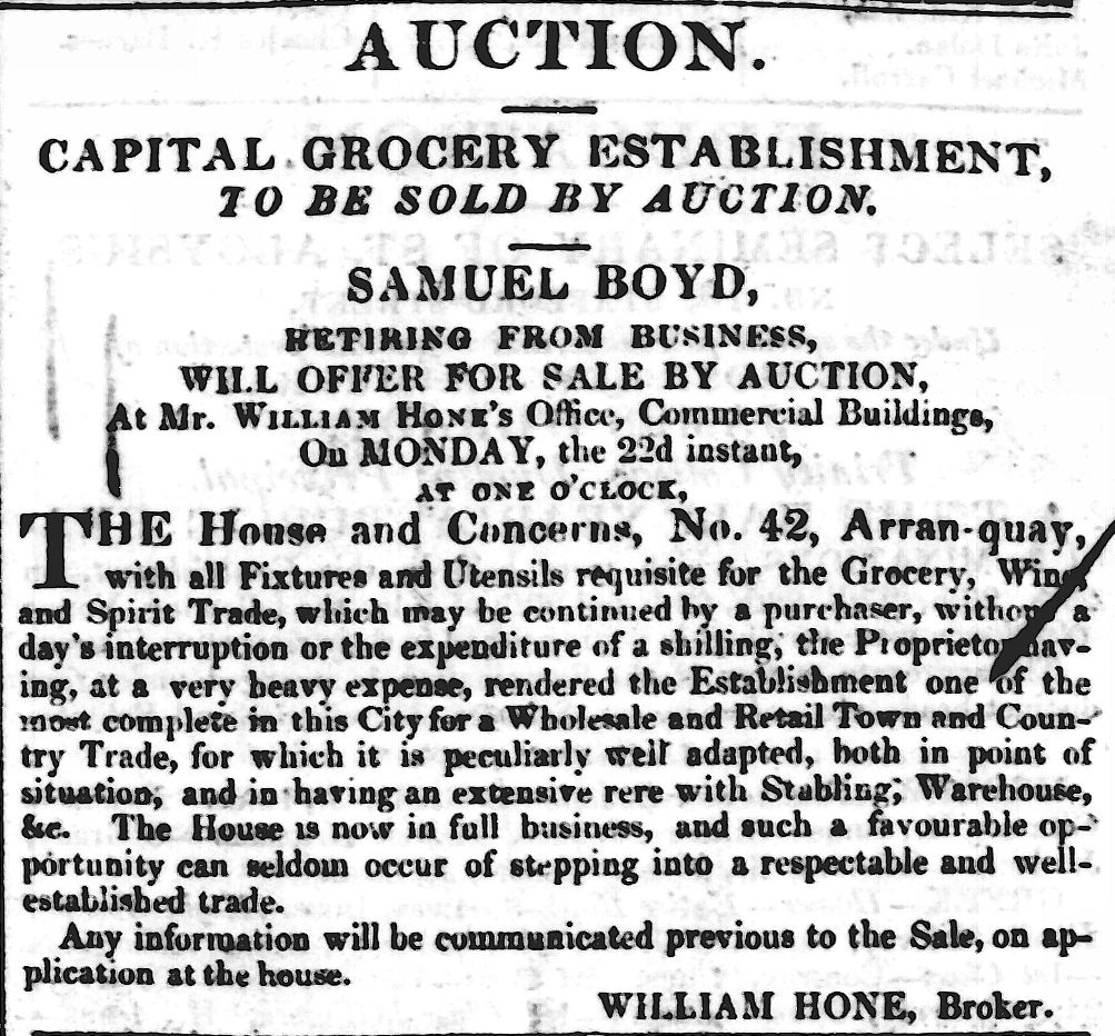 After just a few years in August 1831 we find a notice that Samuel is retiring from business and selling his premises and fittings etc. at 42 Arran Quay, Dublin.