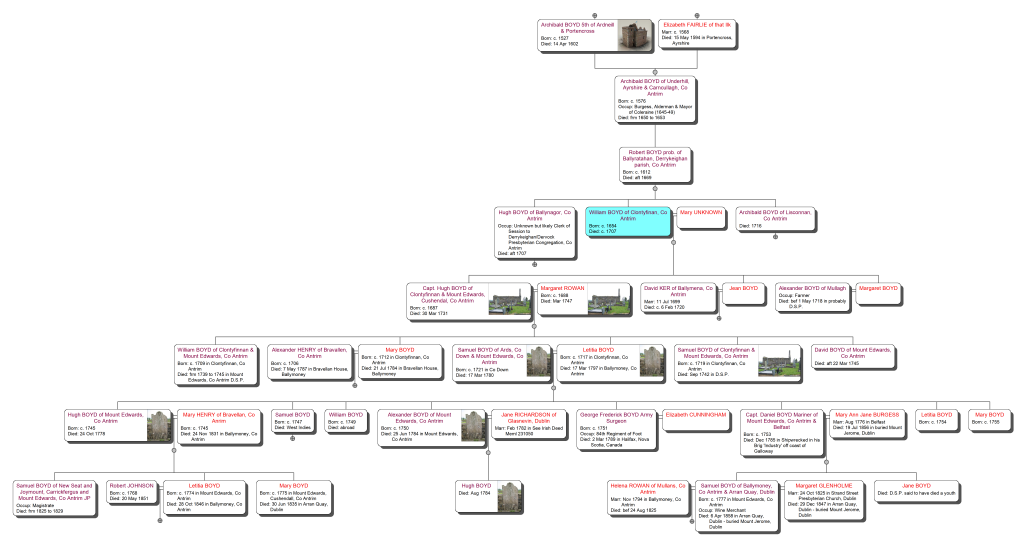 This branch of the Boyd family in Co Antrim descended from Robert, son of Archibald Boyd of Underhill, West Kilbride Ayrshire and Carncullagh, Derrykeighan Parish, Co Antrim.