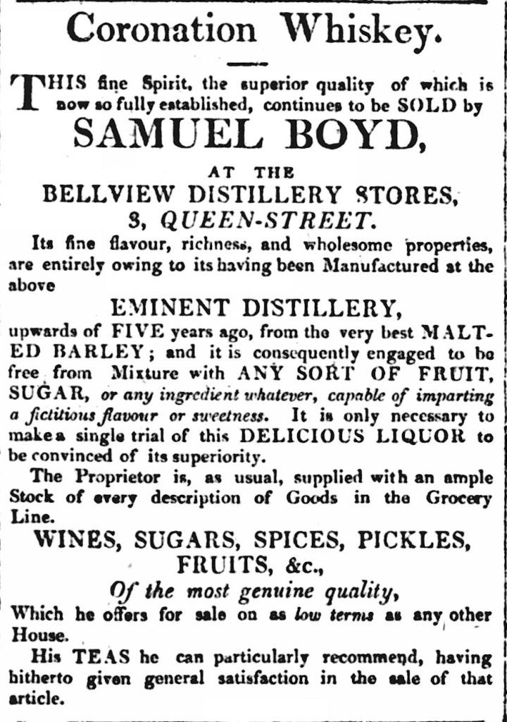 By 1820 we find Samuel Boyd running a Delf and Glass Warehouse business at East Arran Street, Dublin56 and by 1822 he has a substantial grocery business called the ‘Bellview Distillery Stores’ located at 3 Queen Street, Dublin.