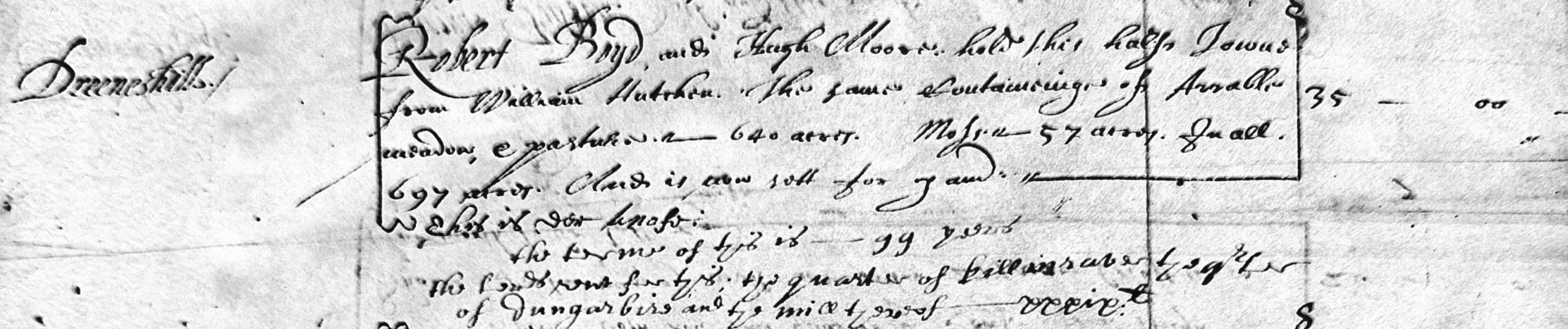 | Dreeneshill {Greenshields Upper & Lower, Barony of Upper Dunluce, Ballymoney Parish, Co Antrim}. | Robert Boyd and Hugh Moore hold this halfe Towne from William Hutchen. The same containing of Arable meadow, & pasture – 640 acres. Moss – 57 acres. In all 697 acres. Land is now sett [?] [?] [?] [?] [?] [?] the terme of this is – 99 years The lands [?] [?] the quarter of killinraver the qter of dungarbire and the mill thereof – XXXiXl {£39} | 35 – 00 |