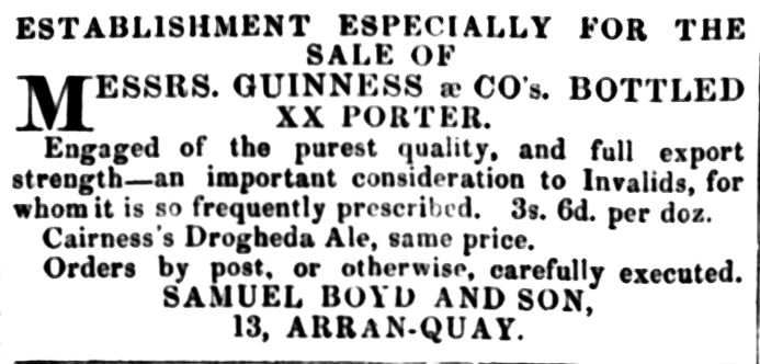 We believe by 1846 Samuel had started up again in business, this time with his son George Frederick. The new business ‘Samuel Boyd & Son’ was based at 13 Arran Quay, Dublin not far from his previous premises and remarkably from the above advert the mainstay of the business was the sale of bottled porter from the famous Messrs. Guinness, today arguably one of the most internationally famous brands in the world.